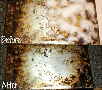 In the before picture you can see that he sprayed the right side of the tray with the Dawn Power Dissolver, then he waited a half hour and then wiped off the cleaner.