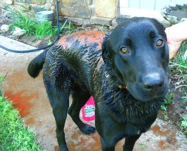 The picture above is of a dog named Moose, who got sprayed by a skunk. He's just been washed in both tomato juice and dishwashing soap in an attempt to get the stink off of him.